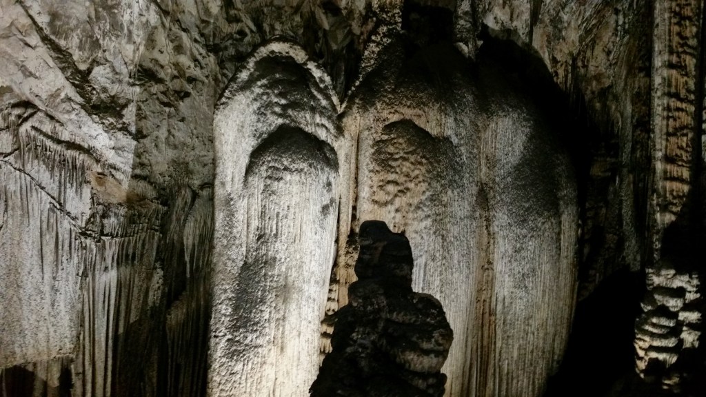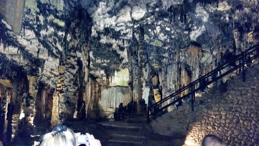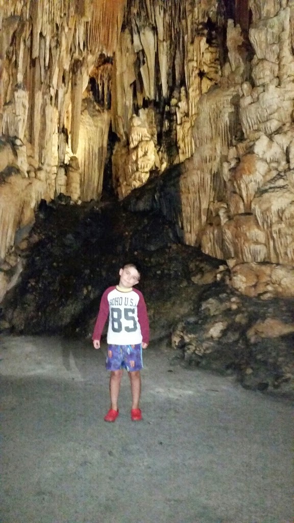 la visita es guiada y dura aproximadamente unos 45 minutos a lo largo de 7 diferentes salones. Los dos nos quedamos alucinados y nos dedicamos a buscar formas de animales en todas las columnas y formaciones rocosas. Y además en estas cuevas está el infierno. No te has de preocupar, es una de las salas que hay en el recorrido donde disfrutarás de un espectáculo de luz y sonido