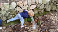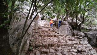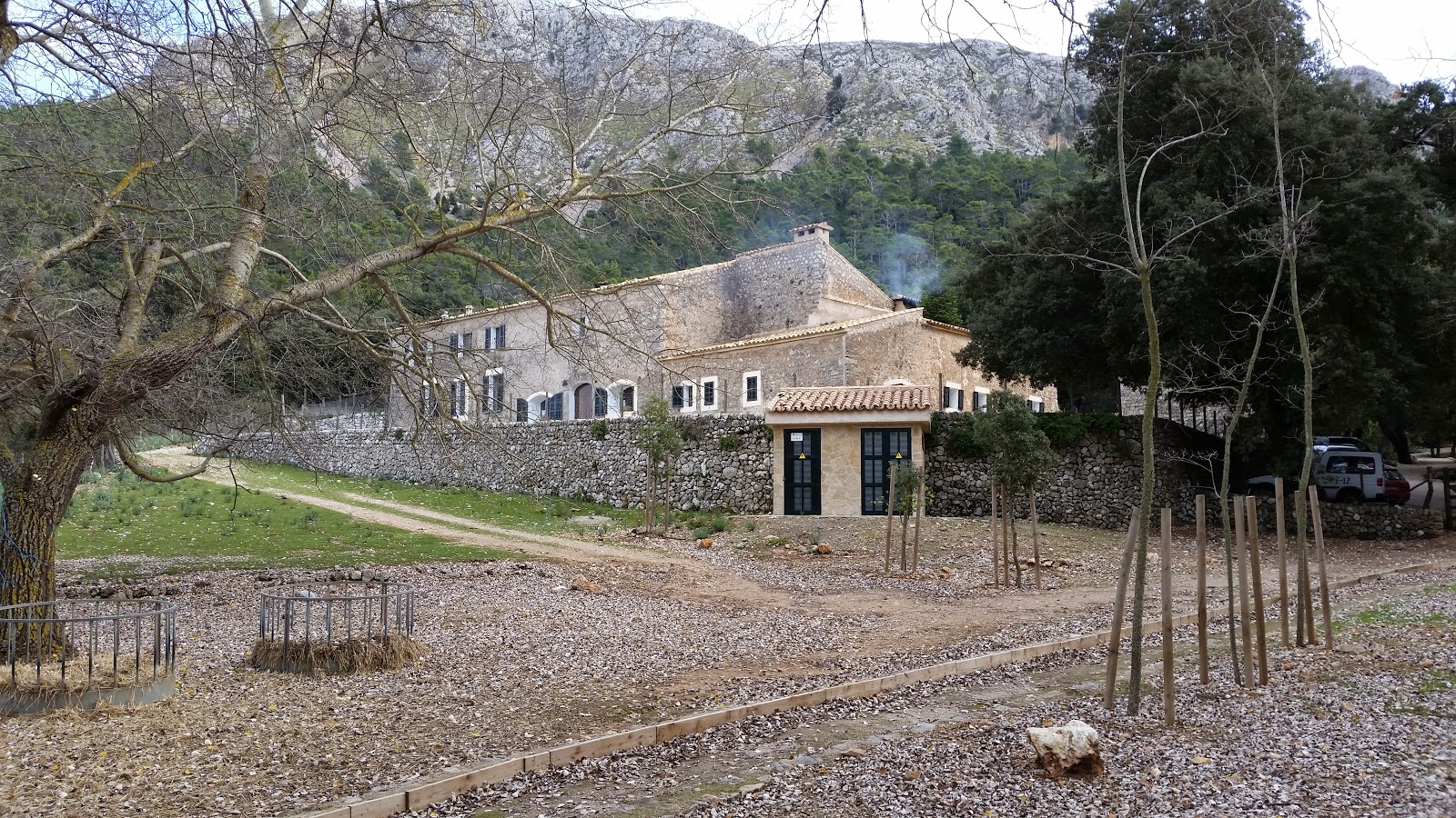 Emprendemos la marcha desde los porches que hay al fondo a la derecha del monasterio donde hay una puerta de metal desde la cual se inicia un camino asfaltado que va paralelo al torrente de LLuc. Seguimos camino y llegaremos a un campo de futbol donde vale la pena pararse un momentito y ver las formaciones rocosas que lo envuelven.Más adelante vamos a encontrar una señal junto a un pequeño puente que nos indica el inicio de la visita a dos lugares muy conocidos de esta zona; Es Camell y sa Cometa des Morts. El primero tal y como indica el nombre, se trata de una enorme roca con la forma de este animal que el agua ha ido esculpiendo durante miles de años. La segunda hace referencia a una cueva donde se encontraron restos de enterramientos de la época pretalaiótica (fuente: centre d’informació de la Serra de Tramuntana). Para los niños (y los no tanto) es una experiencia entrar en esta cueva y visitar el interior. Entre ambos lugares vale la pena pararse un momento a observar una impresionante «Sitja» y explicar a los niños como se hacia el carbón antiguamente.