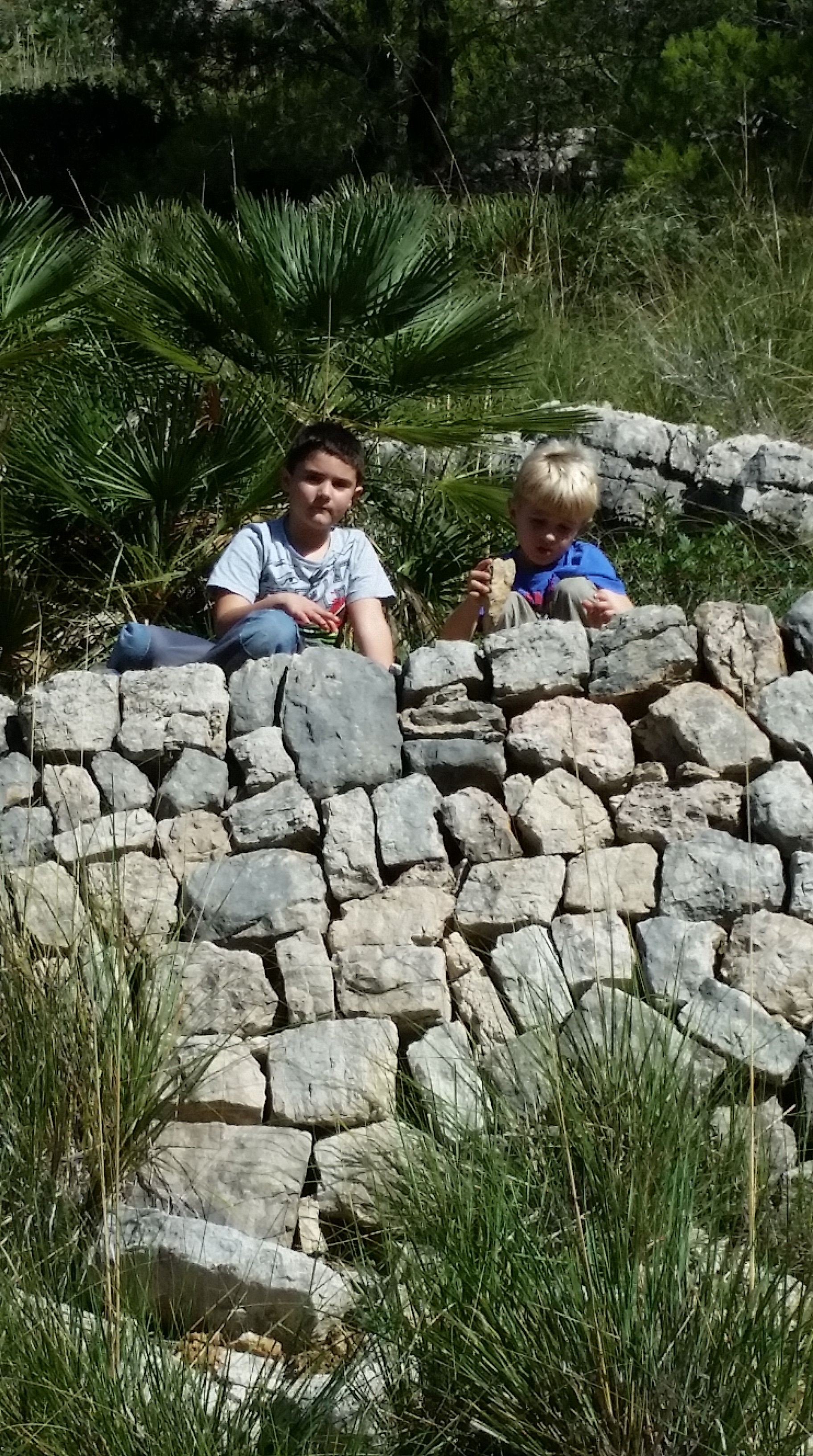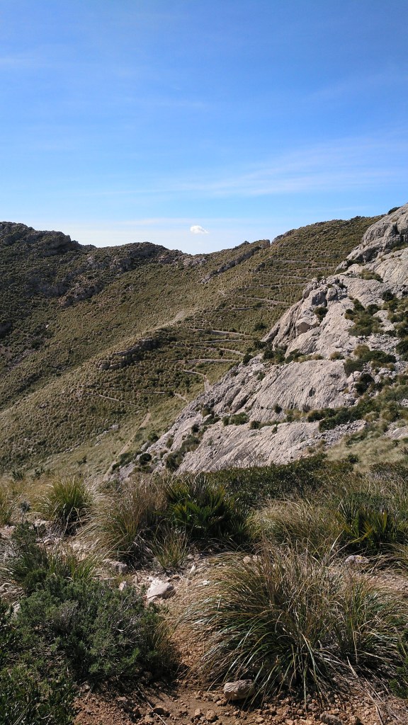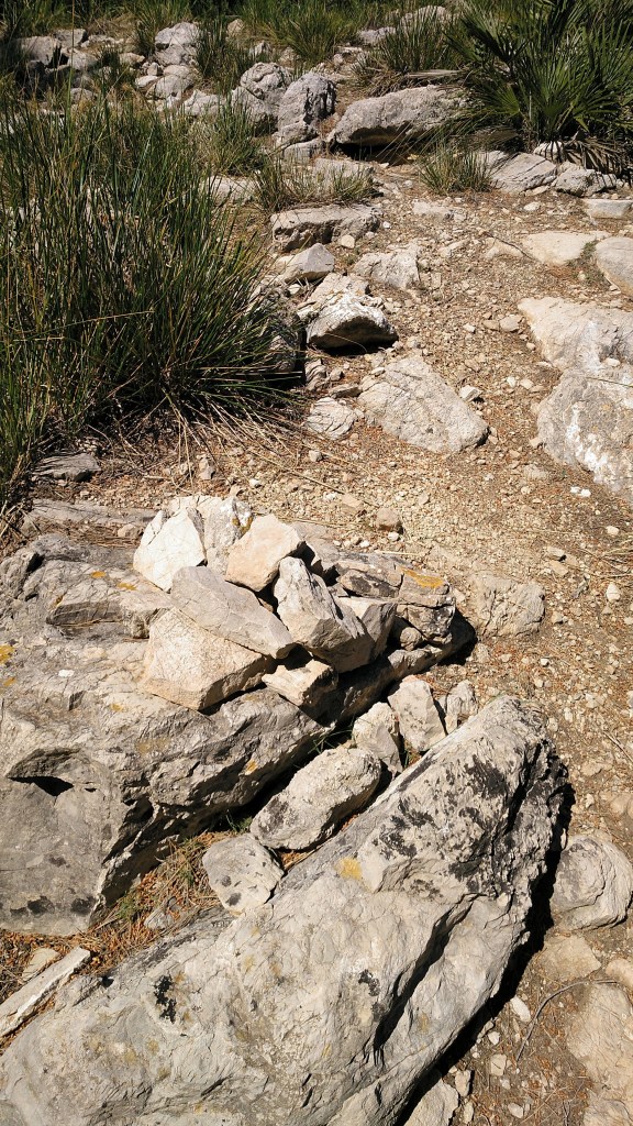 Empezamos la ascensión desde el nivel de mar hasta el coll de sa Bretxa (245m) y es Fumat (334m). El camino que seguiremos es el antiguo camino que llevaba al faro de Formentor. Ya desde el inicio vemos que al contrario que la bajada a la cala que era bastante cubierta, no hay prácticamente sombras durante toda la subida lo que la hace dura en días calurosos. Es importante fijarse en el camino ya que es en zig zag, no hay muchos hitos que nos guíen pero en realidad si prestamos atención, no son necesarios. Si nos atrevemos a acortarlo, se puede endurecer bastante aunque si los pekes están en forma, van a disfrutarlo mucho más. Desde luego hay que disfrutar de las vistas durante toda la ascensión ya que son espectaculares.