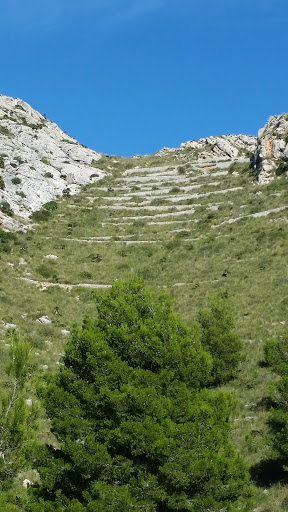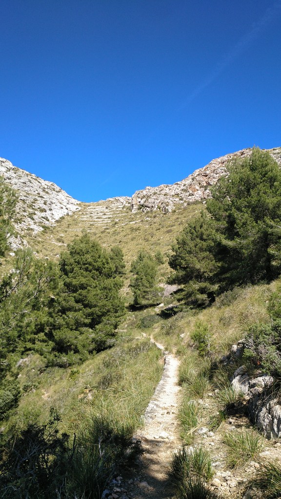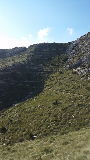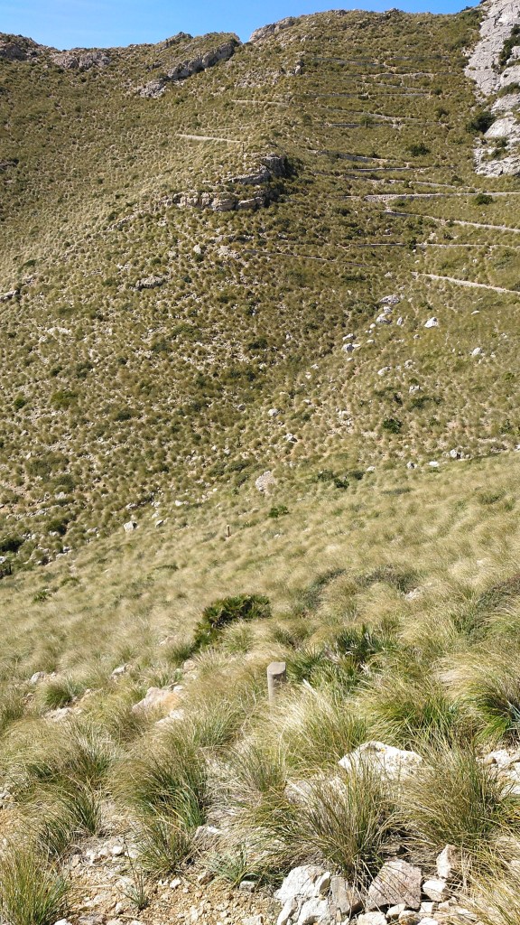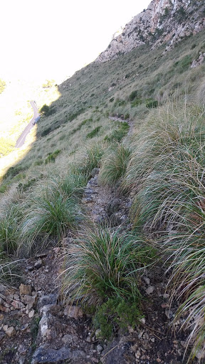 El camino de bajada es muy fácil, es seguir el camino que vemos en zig zag. Si siguiéramos bajando, nos conduciría a la cala que mencionamos antes. Hemos de remontar el camino hacia arriba. Una vez alcanzamos el collado, tenemos la bajada hacia la carretera. Mucha atención ya que los bancales que marcan el camino han prácticamente desaparecido, el terreno es resbaladizo y lleno de carrizo.