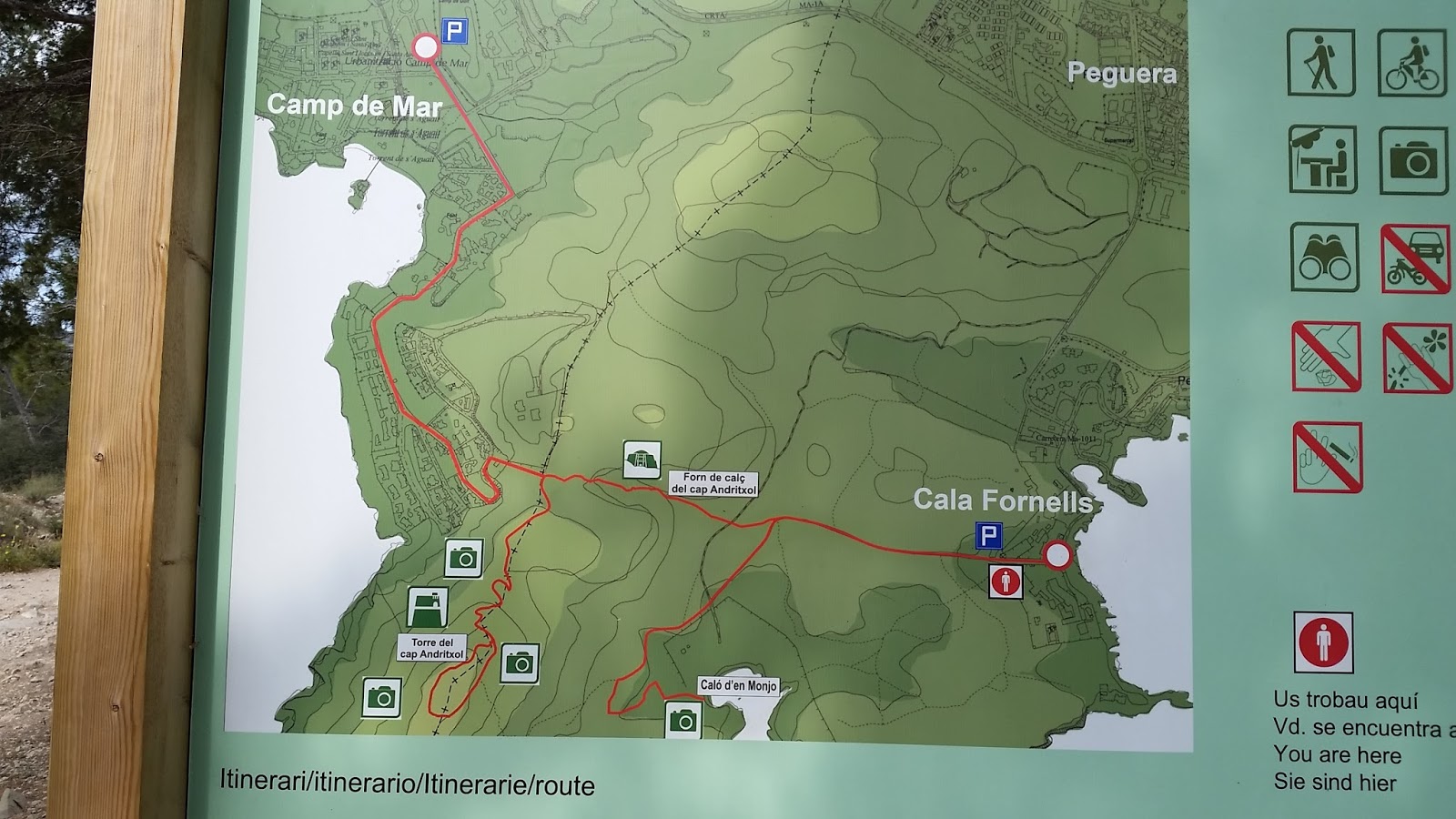 El inicio de nuestra excursión es en Cala Fornells. Al final de la carretera del mismo nombre, llegamos a dos hoteles en los que hay un pinar donde podremos dejar el coche. Es mejor llegar pronto porque si vamos en primavera sera complicado encontrar parking
