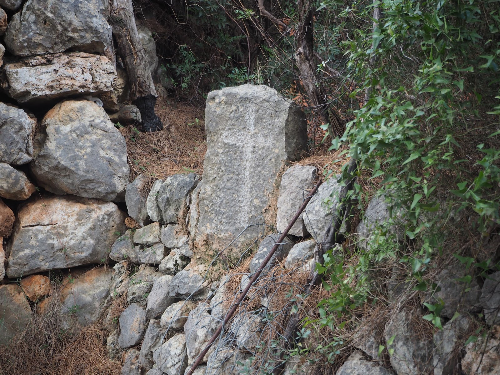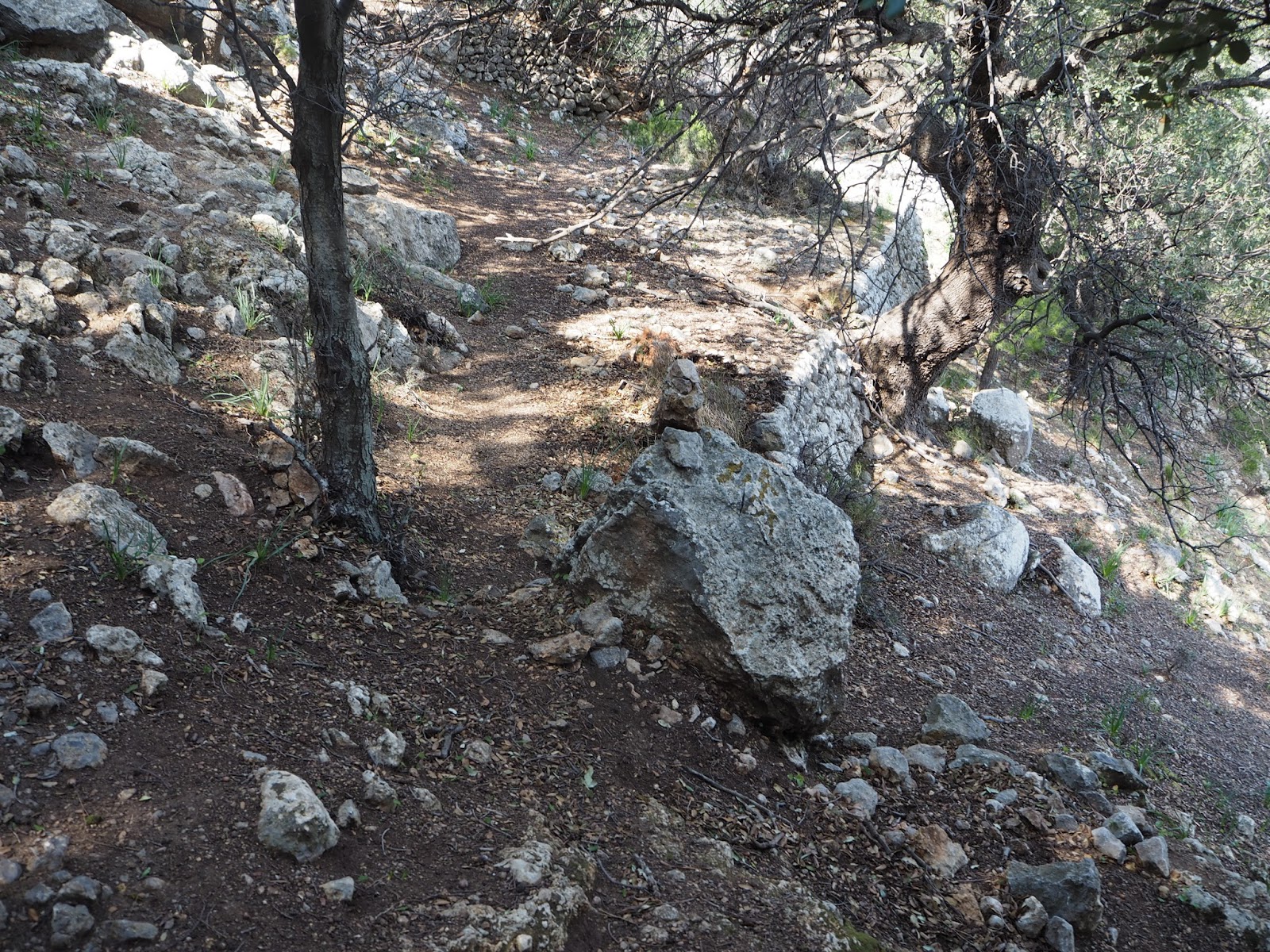 Al ser una propiedad privada no podemos atravesarla, lo que nos obliga a seguir el camino. Enseguida que podamos, giraremos a la izquierda e iremos paralelos a la possessió. En este punto, el camino se complica un poco y hemos de fijarnos en las fitas que nos marcarán el camino durante unos 10 minutos hasta que vemos un acceso a la possessió y enlazamos con el camino.