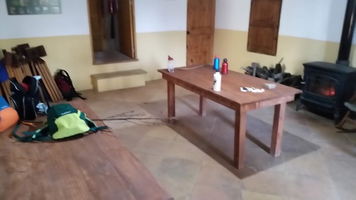 También hay un amplio salón con chimenea, 2 mesas grandes y sillas. Si el tiempo acompaña, una opción es sacar estas mesas y comer fuera. Cocina completamente equipada y despensa donde encontraremos productos básicos como por ejemplo azúcar, sal, aceite que han ido dejando otros huéspedes.